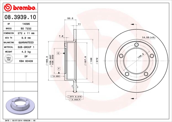 BREMBO brzdový kotouč 08.3939.10 Ean: 8020584393918