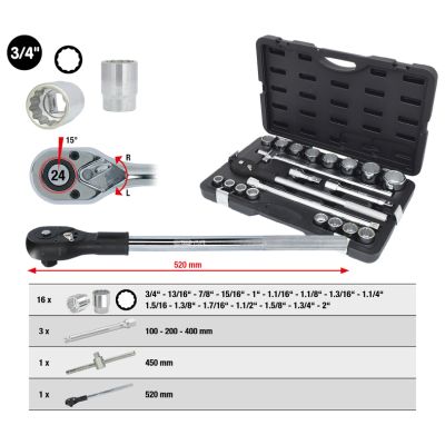 •velikosti v palcích •profil FlankTraction •dvanáctihran •matné satinování •slitina chromu a vanadu •v pevném umělohmotném kufříku
