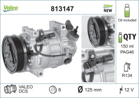 Napětí [V] : 12 V Omezení výrobce : VALEO Hmotnost [kg] : 6,77 kg řemenice - ? [mm] : 114 mm Doplňující výrobek/info 2 : s kompresorovým olejem PAG Olejová náplň - množství (ml) : 150 ml Olej do kompresoru : PAG 46 Kompresor -ID : DCS nový díl : Počet drážek : 5 Chladicí látka : R 134a