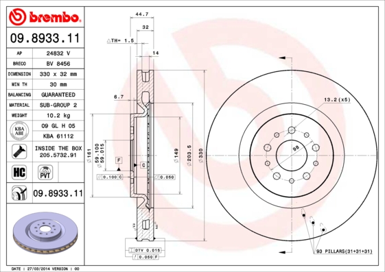 BREMBO brzdový kotouč 09.8933.11 Ean: 8020584014615