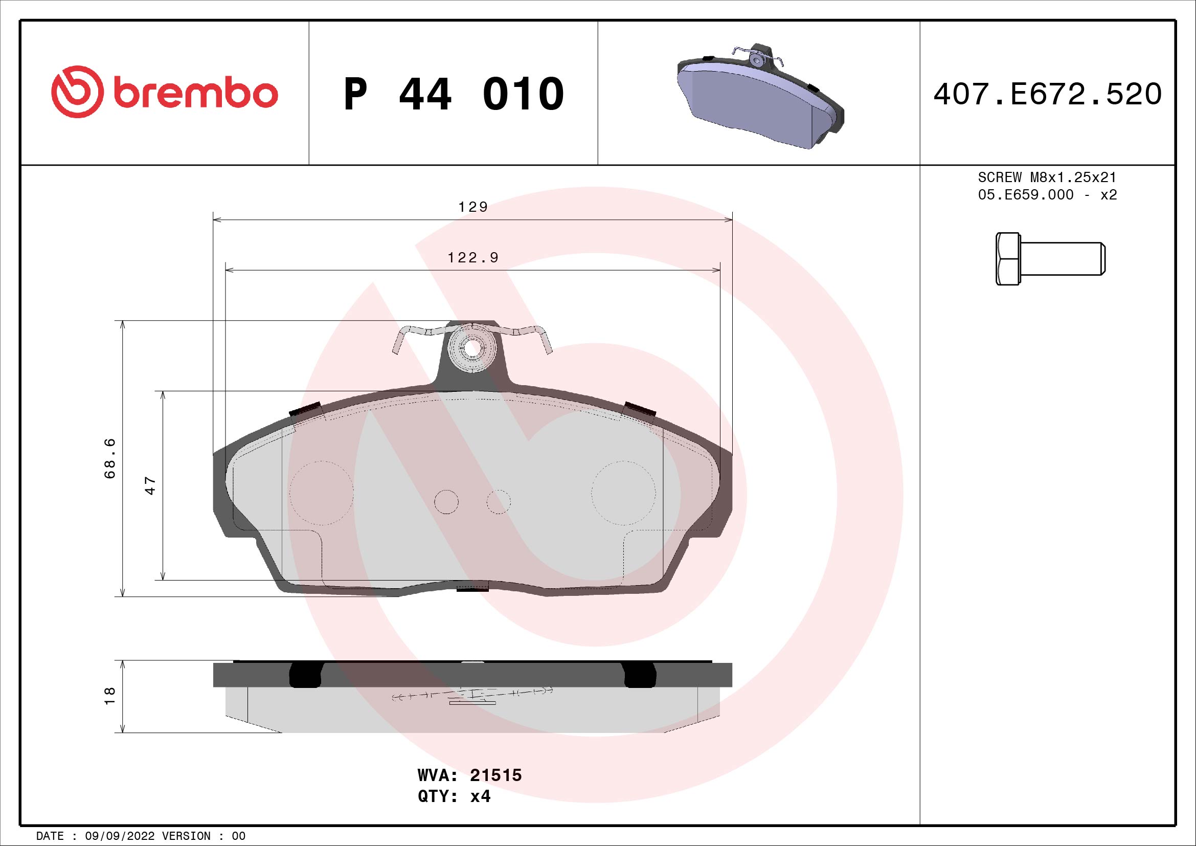 BREMBO sada brzdových destiček, kotoučová brzda P 44 010 Ean: 8020584053331