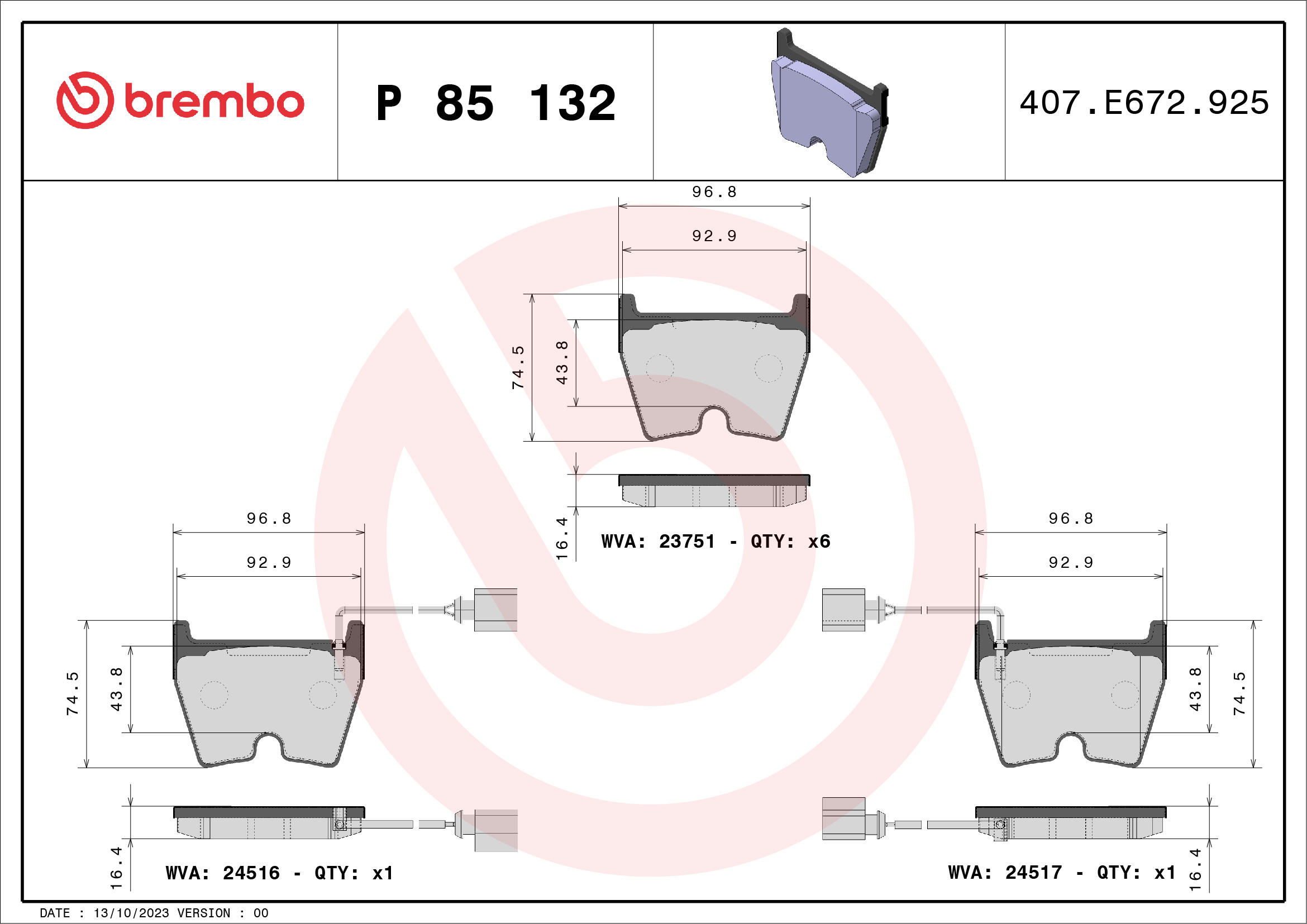 BREMBO sada brzdových destiček, kotoučová brzda P 85 132 Ean: 8020584110140
